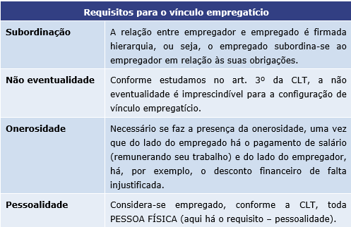Desse modo, são requisitos necessários para a caracterização da relação de emprego: subordinação, não eventualidade, onerosidade e pessoalidade.