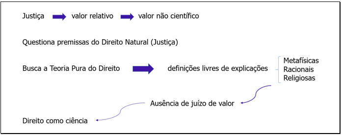 Esse autor é a referência do positivismo jurídico. Seu esforço era constituir o direito como ciência, e, para tanto, utilizava métodos aplicados às ciências exatas (que descrevem fenômenos objetivamente). Ao analisar o conceito de justiça ele a percebe como algo relativo, não havendo como definir uma certeza em relação a esse conceito. Por isso, justiça, pra ele, é um valor não científico. E, não sendo científico não poderia ser a base do ordenamento.