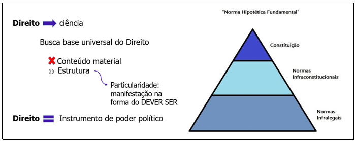 Para tanto, ele precisava encontrar a validade objetiva típica daquela encontrada nas ciências naturais (causa e consequência). Então, ele passa a buscar em suas pesquisas a base universal do Direito. Sua conclusão se dá no sentido de que não era possível encontrar universalidade no conteúdo material das normas já que ele varia conforme tempo e cultura da sociedade ao qual se refere. Assim, o fundamento jurídico universal estaria na estrutura, ou seja, na forma como as leis se manifestam. E elas se manifestam na forma do DEVER SER (conduta esperada) que é a base imputável do direito. Então, Kelsen conclui que o direito é único por se manifestar de forma normativa.
