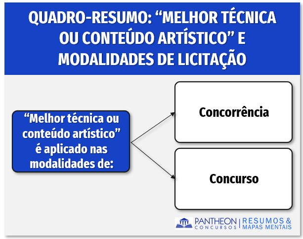 Quanto ao critério ora estudado devemos levar duas informações importantes. Em primeiro lugar, o critério de julgamento “técnica e preço” é utilizado exclusivamente na concorrência. Assim, quando for citado o critério de julgamento “técnica e preço” na questão, necessariamente estaremos diante de uma concorrência (art. 6º, inciso XXXVIII, alínea “c”, da NLLC).