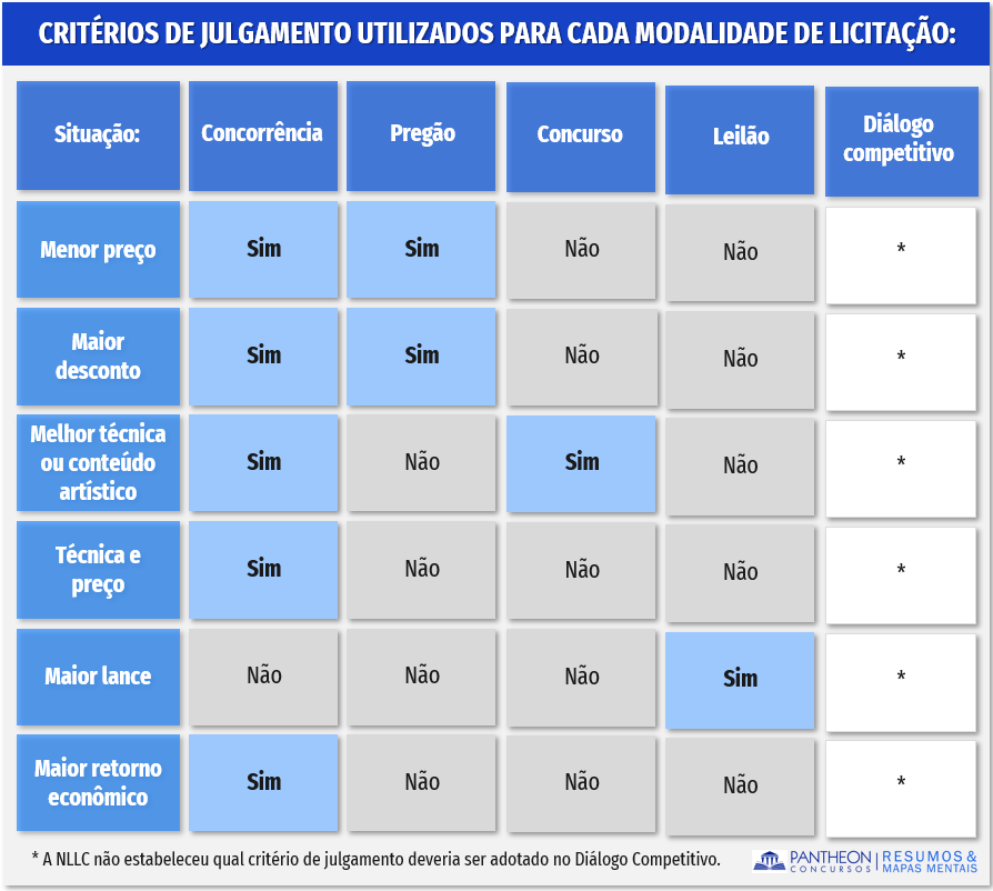 Mas os dois conceitos são interligados pela NLLC. Diante disso, montamos uma tabela comparativa com os critérios de julgamento utilizados para cada modalidade de licitação: