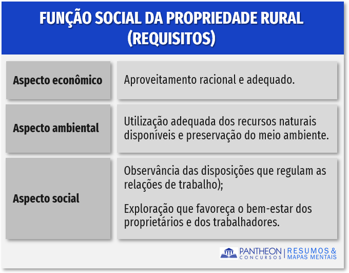 De acordo com o art. 186 da CF, a função social é cumprida quando a propriedade rural atende, simultaneamente, segundo critérios e graus de exigência estabelecidos em lei, aos seguintes requisitos: I – aproveitamento racional e adequado; (aspecto econômico); II – utilização adequada dos recursos naturais disponíveis e preservação do meio ambiente; (aspecto ambiental); III – observância das disposições que regulam as relações de trabalho; (aspecto social); IV – exploração que favoreça o bem-estar dos proprietários e dos trabalhadores. (aspecto social).