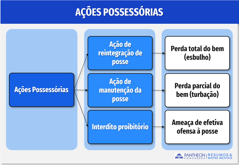 No ordenamento jurídico pátrio, há três tipos diferentes de ações possessórias: (i) ação de reintegração de posse; (ii) a ação de manutenção da posse; e (iii) o interdito proibitório. Cada qual se diferencia conforme a pretensão do autor.