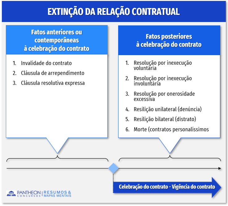 Segue o quadro-resumo que esquematiza as hipóteses de extinção do contrato, separamos o quadro em dois pontos temporais: