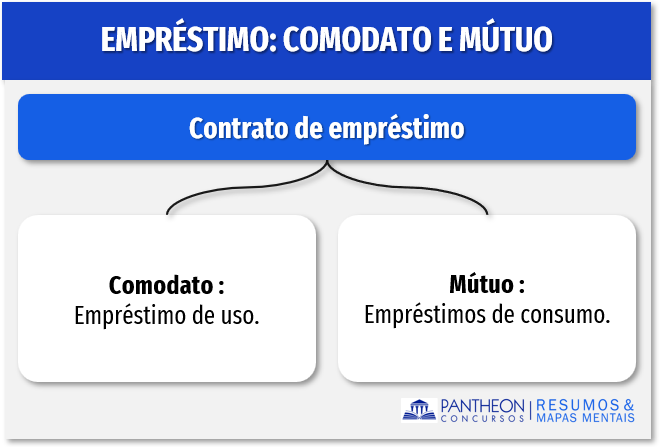 Portanto, esse contrato é unilateral e gratuito. O CC, divide o contrato de empréstimo em duas espécies: o comodato (empréstimo de uso) e o mútuo (empréstimos de consumo).