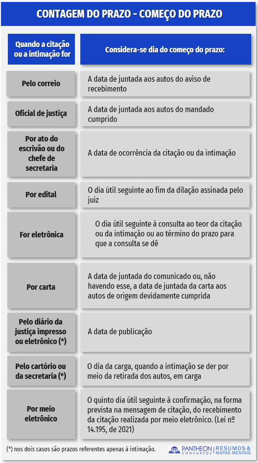 Como vimos acima, salvo disposição em contrário, os prazos serão contados excluindo o dia do começo e incluindo o dia do vencimento, bem como, na contagem do prazo somente serão considerados dias uteis (art. 224 c/c art. 219, CPC). No mesmo sentido, afim de operacionalizar a contagem do prazo, o art. 231 estabelece quais serão os dias do começo do prazo para determinadas hipóteses, vejamos: