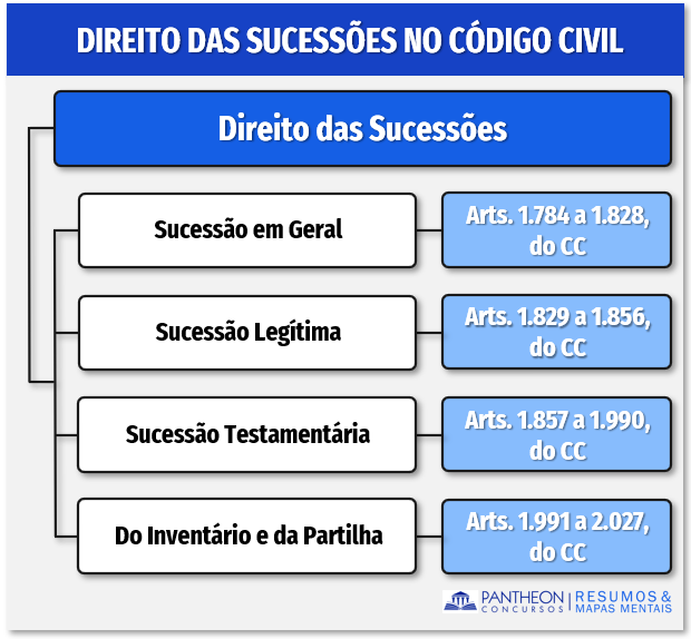 O Código Civil trata do Direito das Sucessões em quatro Títulos: Título I Da Sucessão em Geral (CC, arts. 1.784/1.828); Título II Da Sucessão Legítima (CC, arts. 1.729/1.756); Título III Da Sucessão Testamentária (CC, arts. 1.757/1.990); Título IV Do Inventário e da Partilha (arts. 1.991/2.027).