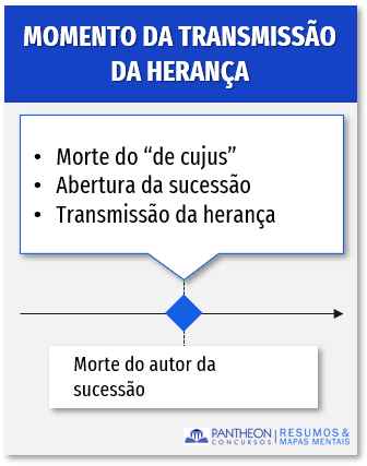 O momento da transmissão da herança se dá no mesmo momento da morte do autor da sucessão. Assim, três situações ocorrem de forma simultânea: