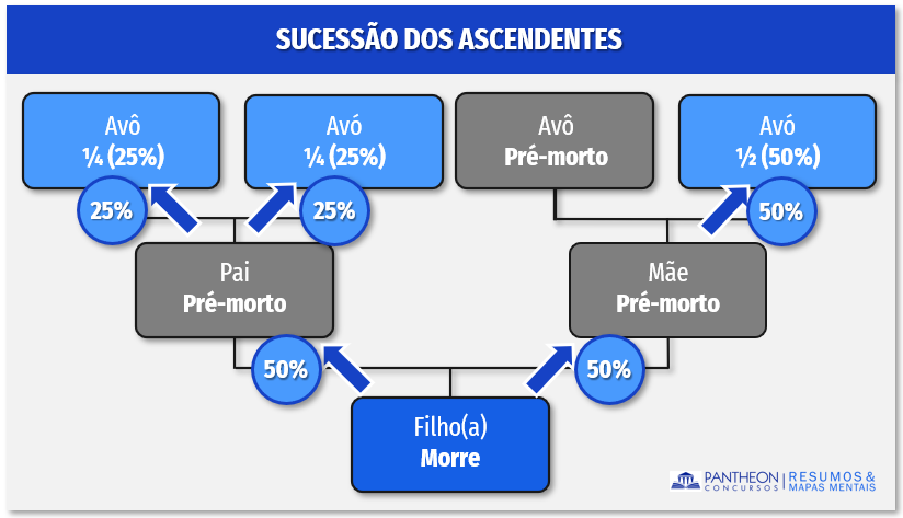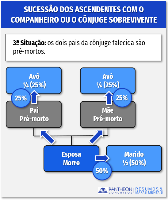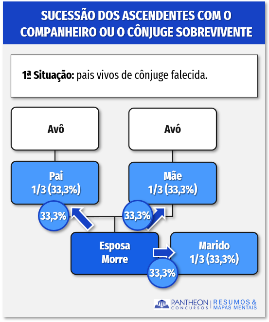 Na falta de descendentes, são chamados à sucessão os ascendentes, em concorrência com o cônjuge ou companheiro sobrevivente (CC, art 1.829 c/c 1.836 e STF, RE 878.694/MG). Não importará o regime de bens adotado, na sucessão o cônjuge sobrevivente ou companheiro sempre concorrerão com os ascendentes (CC, art. 1.829, II). Exemplo: cônjuge morre deixando pais vivos e o marido.