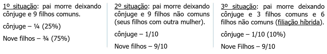 Enunciado n. 527 CJF/STF: “Na concorrência entre o cônjuge e os herdeiros do de cujus, não será reservada a quarta parte da herança para o sobrevivente no caso de filiação híbrida.”