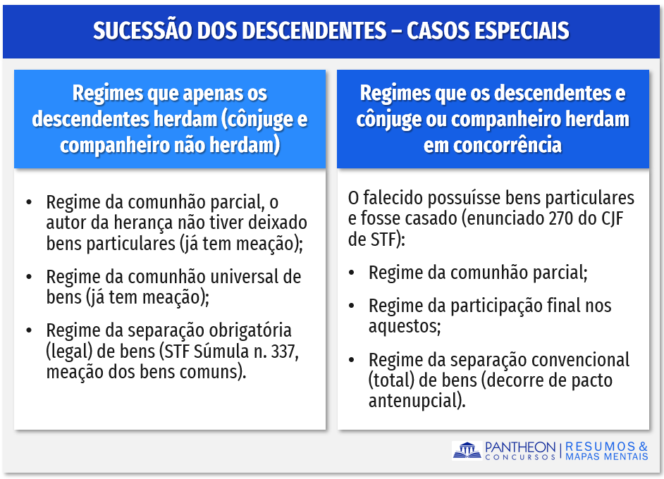Em primeiro lugar na ordem de sucessão legitima estão os descendentes (filhos, netos, bisnetos etc.) em concorrência com o companheiro ou cônjuge sobrevivente, ressalvado, para esses últimos, se o regime de bens com o falecido for regime da comunhão universal ou no caso da separação obrigatória de bens; ou se, no regime da comunhão parcial, o autor da herança não houver deixado bens particulares. São muitas informações, por isso vamos tratar de forma segmentada.