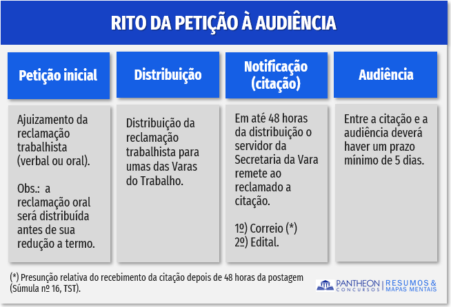 Após ser protocolada a reclamação o escrivão ou secretário, dentro de 48 horas, remeterá a segunda via da petição, ou do termo, ao reclamado (réu), notificando-o ao mesmo tempo, para comparecer à audiência do julgamento, que será a primeira desimpedida, depois de 05 dias (CLT, art. 841, CLT).