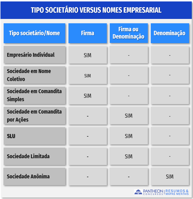 Para facilitar nossa revisão montamos um esquema relacionando as diferentes sociedades empresárias, os empresários individuais e o EIRELI com seus respetivos nomes empresariais: