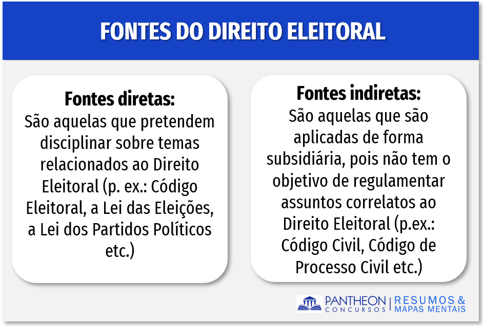 Por fim, temos as fontes diretas e indiretas no Direito Eleitoral. As fontes diretas são aquelas que, em sua origem, pretendem disciplinar temas correlatos ao Direito Eleitoral, tais como: o Código Eleitoral, a Lei das Eleições, a Lei dos Partidos Políticos etc. Por seu turno, as fontes indiretas são aquelas que são aplicadas aos temas relacionados ao Direito Eleitoral de forma subsidiária, como: o Código Civil, o Código de Processo Civil, Código Penal etc.