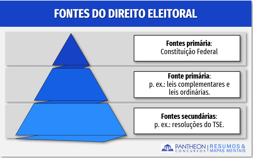 As fontes do Direito Eleitoral podem ser classificadas como fonte primária e secundária. São fontes primárias aquelas que emanam do Poder Legislativo quando atua em sua função típica, como a Constituição Federal – CF, as leis complementares e ordinárias atinentes ao Direito Eleitoral. Já as fontes secundárias são aquelas que regulamentam os atos normativos produzidos pelo Poder Legislativo em sua função típica, como por exemplo as resoluções do TSE.