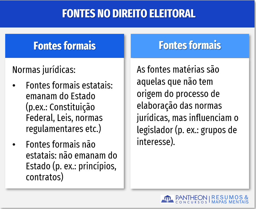 Já as fontes formais estatais são as normas jurídicas emanadas pelo Estado como: como: Código Eleitoral – Lei nº 4.737 de 1965, que organiza o exercício do direito político; Lei das Eleições – Lei nº 9.504 de 1997, que dispõe sobre as normas para as eleições; Lei dos Partidos Políticos – Lei nº 9.096 de 1995, que dispõe sobre os partidos políticos; Lei das Inelegibilidades – Lei Complementar nº 64 de 1990, que instituiu as inelegibilidades, na forma do artigo 14, parágrafo nono, da Constituição Federal; Resoluções do Tribunal Superior Eleitoral – TSE, quando editadas para tratar de regras gerais; Jurisprudências anteriores do STF e TST; Consultas, quando dizem respeito a respostas orientadoras, apenas para esclarecimento, que não abordem assuntos concretos.