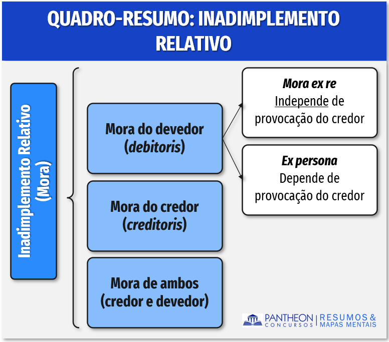 Inadimplemento relativo (mora): há o descumprimento parcial da obrigação, mas seu cumprimento ainda é útil. Isto é, não houve o cumprimento perfeito do que foi pactuado, pois a prestação não foi cumprida no tempo, lugar e forma que a lei ou a convenção estabeleceu, mas a obrigação ainda pode ser cumprida. (art. 394, CC). P. ex. uma empresa é contratada para pintar de branco as paredes internas de uma ala de um hospital, a empresa pinta a ala, mas com a cor roxa, houve, portanto, o inadimplemento relativo da obrigação, as paredes foram pintadas, mas com cor diversa da pactuada.