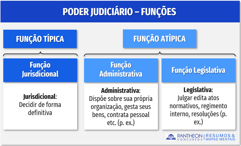 Estudamos os Poderes Executivo e Legislativo e vimos que cada um tem suas funções típicas e atípicas. O Poder Judiciário não é diferente, como dissemos, esse Poder tem de forma típica a função jurisdicional, aplicando a lei (Constituição, Leis infra constitucionais, ato normativos etc.), doutrina, jurisprudência etc., aos casos concretos, visando a pacificação dos conflitos sociais.