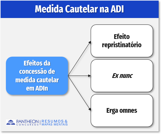 Em relação aos efeitos da concessão de medida cautelar em ADI, temos: a suspensão do o ato normativo impugnado até o julgamento definitivo da ADI, com isso, a legislação anterior à norma impugnada volta a se tornar aplicável (efeito repristinatório), salvo expressa manifestação em contrário; em regra, os efeitos da concessão de medida cautelar são ex nunc, ou seja, não retroagem, salvo expressa manifestação em contrário; por fim, a concessão de medida cautelar em ADI produz efeito erga omnes, vinculando os demais Poderes e as demais esferas.