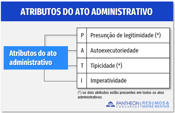 Assim, estudaremos os atributos conforme classificação da professora Di Pietro, logo, são atributos do ato administrativo: (1) presunção de legitimidade, (2) imperatividade; (3) autoexecutoriedade; (4) tipicidade. Para facilitar, os atributos do ato administrativo podem ser memorizados pelo famoso minemónico PATI: