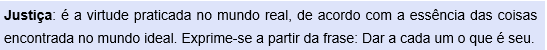 • Justiça= virtude praticada no mundo real + essência das coisas encontrada no mundo ideal