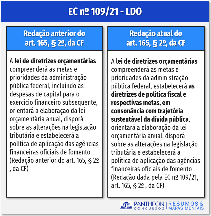 Assim, a nova redação da EC 109/21 estabeleceu que a LDO deverá estabelecer as diretrizes de política fiscal e respectivas metas, em consonância com trajetória sustentável da dívida pública. Ainda na forma do § 2º do art. 165 da CF, a LDO orientará a LOA e disporá sobre as alterações na legislação tributária e estabelecerá a política de aplicação das agências financeiras oficiais de fomento (p. ex. BNDES).