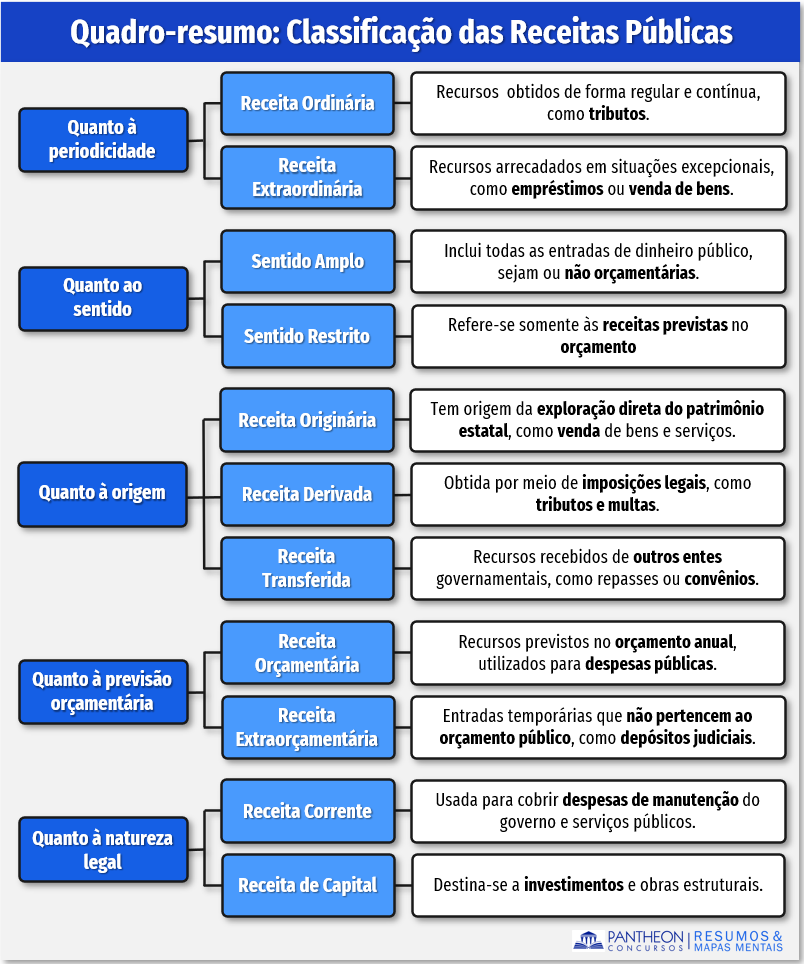 São diversas as classificações das receitas, abaixo trataremos das principais cobradas nas provas de concurso público: classificação das receitas públicas quanto à origem – originárias, derivadas e transferidas; classificação quanto ao motivo de entrada – receitas correntes e receitas capital; quanto à periodicidade – receita ordinária e extraordinária; quanto à previsão orçamentária – orçamento e extraorçamentária.