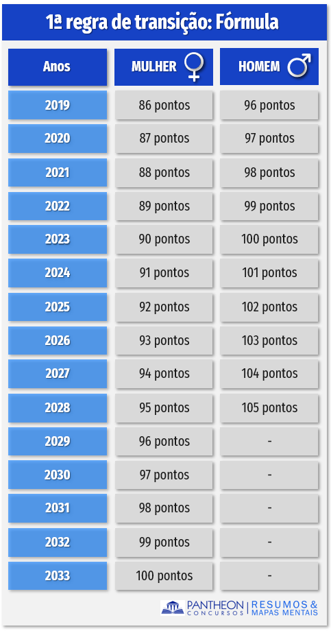 Notem que nessa regra não há idade mínima para se aposentar, mas sim há a necessidade de o segurado alcançar os valores pré-definidos para adquirir tal direito. Esses valores são o resultado da somatória da idade com o tempo de contribuição, por isso tal regra recebe a denominação de regra da fórmula.