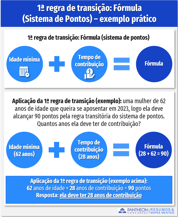 Para facilita vamos montar um exemplo: suponhamos que uma mulher de 62 anos de idade queira se aposentar em 2023 pela regra transitória do sistema de pontos (fórmula). Conforme tabela acima, em 2023 a mulher tem que somar 90 pontos, logo ela tem que ter contribuído 28 anos para conseguir se aposentar (62 anos + 28 anos = 90 pontos):