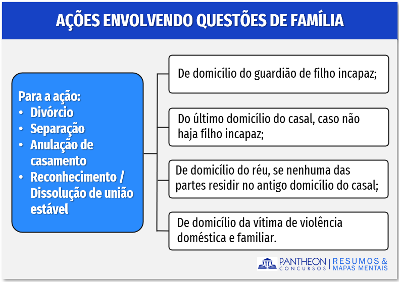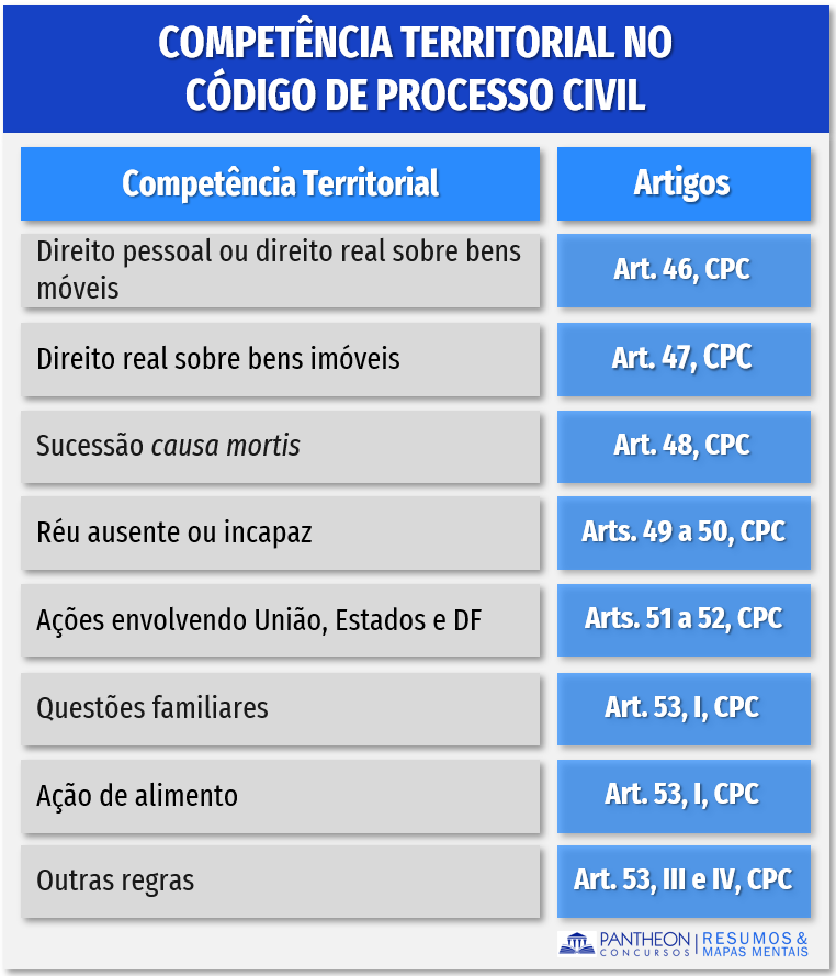 Os arts. 46 a 53 trazem uma série de regras especificas que definem qual será o juiz competente para processar e julgar a ação, para facilitar montamos um esquema que indica a competência com o respectivo artigo: