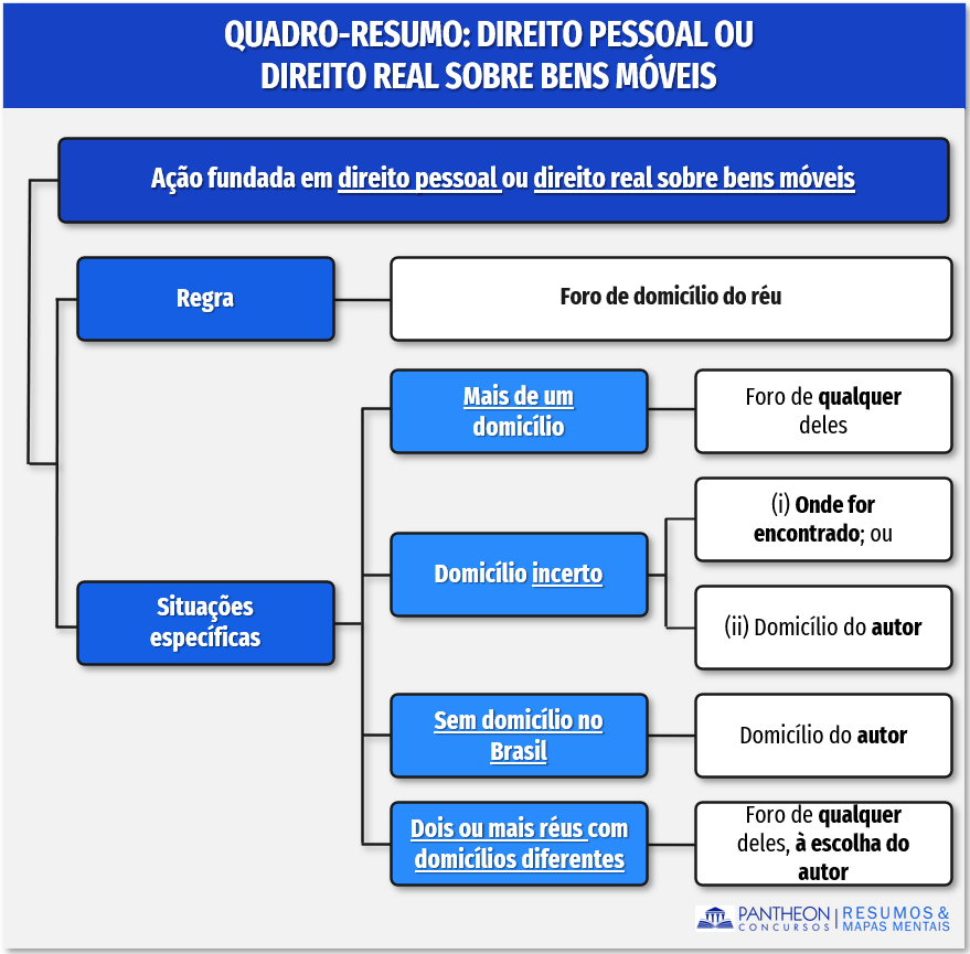 O art. 46, do CPC, prevê que as ações fundadas em direito pessoal ou em direito real sobre bens móveis será proposta, em regra, no foro de domicílio do réu. Os parágrafos daquele artigo estabelecem situações específicas à regra, vejamos o texto do dispositivo para depois fazermos um esquema gráfico: