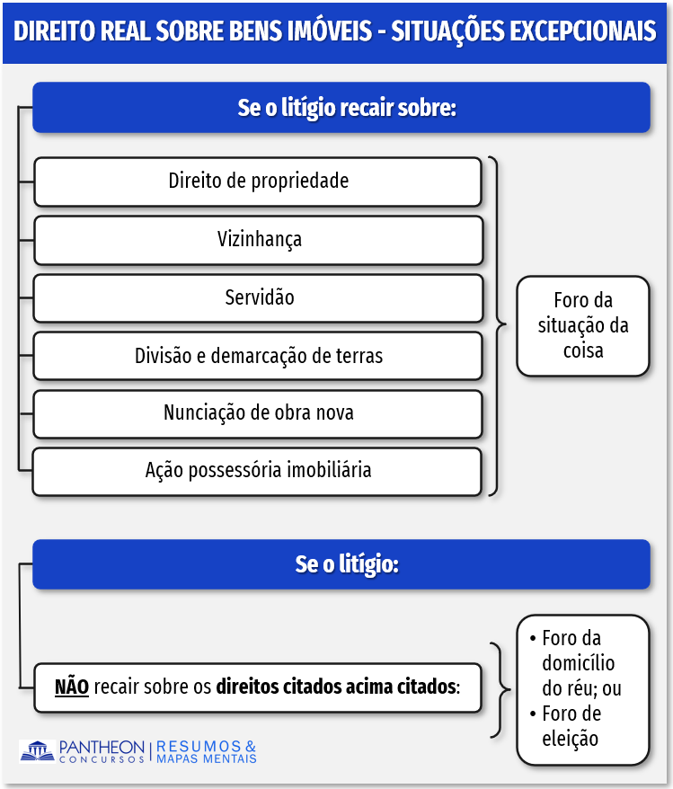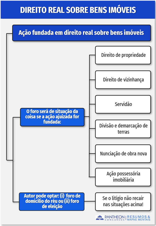 O art. 47, do CPC, dispõe que, “para as ações fundadas em direito real sobre imóveis é competente o foro de situação da coisa”. Os parágrafos 1º e 2º do art. 47, estabelecem regram especiais quanto ao foro para ações fundadas em direito real sobre bens imóveis: