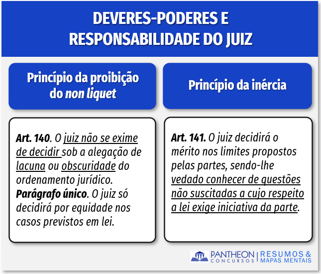 Na sequência o art. 140 estabelece o princípio da proibição do non liquet, que é a vedação ao juiz se eximir de decidir alegando lacuna ou obscuridade da norma. Por sua vez, o art. 141 consagra o princípio da inércia, este veda ao magistrado conhecer questões não suscitadas pela parte que a lei exija tal iniciativa.