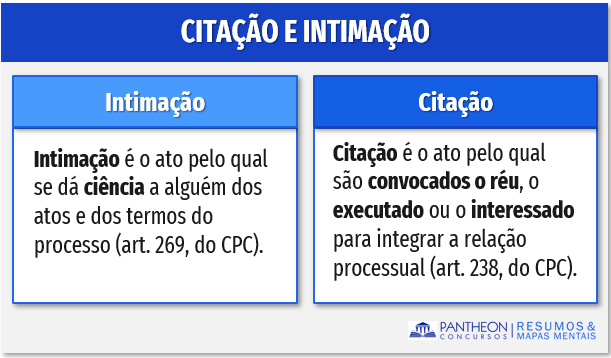 A intimação é o ato pelo qual se dá ciência a alguém dos atos e dos termos do processo (art. 269, do CPC). Logo, a intimação é o ato pelo qual se dá ciência a alguém dos atos e dos termos do processo. Assim, diferentemente da citação, na intimação não há o chamamento para a relação processual, mas sim há a comunicação de ato processual, pois tal relação já está formada.