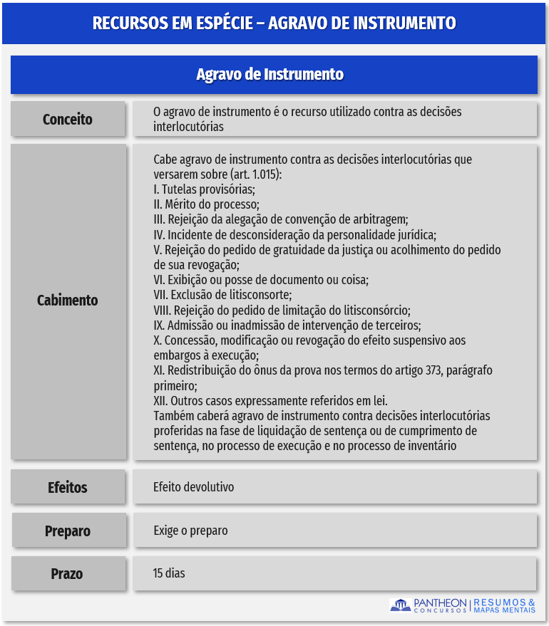 Pois bem pessoal, mas por que a denominação “instrumento”? O agravo de instrumento é dirigido diretamente ao juízo ad quem, em concomitância com o prosseguimento do processo no juízo ad quo. Notem que o agravo de instrumento inicia novo processo em instancia superior, apenas no tocante à decisão interlocutória agravada, o processo no juízo de instância inferior, por sua vez, continua. Dessa forma, o agravante forma o instrumento, que será encaminhado para o tribunal.