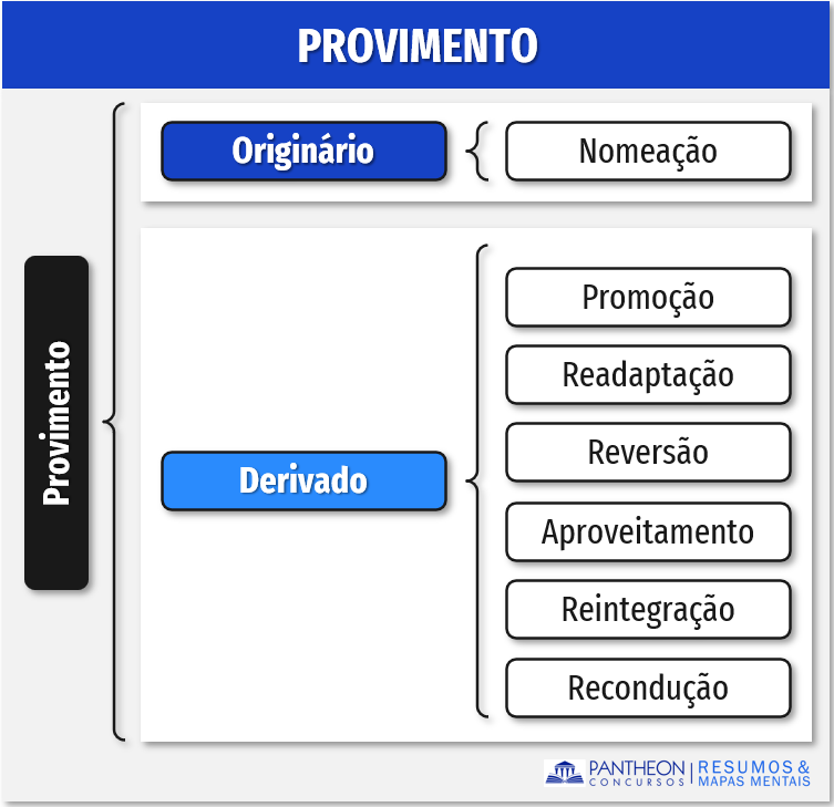 A doutrina divide as sete formas de provimento entre originário e derivado. Na modalidade de provimento originário está apenas a nomeação, pois apenas nessa espécie a pessoa não possui qualquer vínculo anterior com a Administração Pública. Já são classificadas como provimento derivado: promoção; readaptação; reversão; aproveitamento; reintegração; recondução.