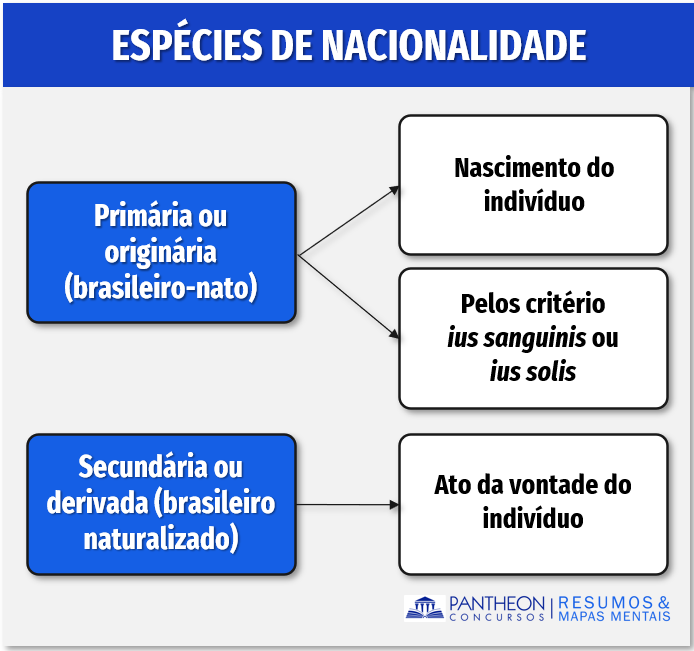 Ultrapassados os conceitos iniciais, vamos analisar a seguir os critérios de atribuição de nacionalidade – ius solis e ius sanguinis e as espécies de nacionalidade - a nacionalidade primária (originária) e a nacionalidade secundária (derivada).