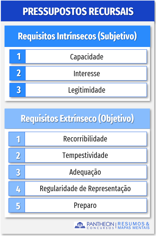 Os pressupostos recursais são os requisitos de admissibilidade do recurso, assim, tais pressupostos devem ser observados para o recurso seja conhecido. Destaquemos, a ausência do pressuposto recursal, em regra, acarretará o não conhecimento do recurso. Por sua vez, o não provimento do recurso refere-se ao julgamento de seu mérito, quando já foi reconhecida sua admissibilidade. Os pressupostos classificam-se em intrínsecos (subjetivos) e extrínsecos (objetivos).