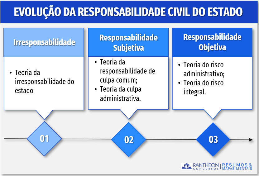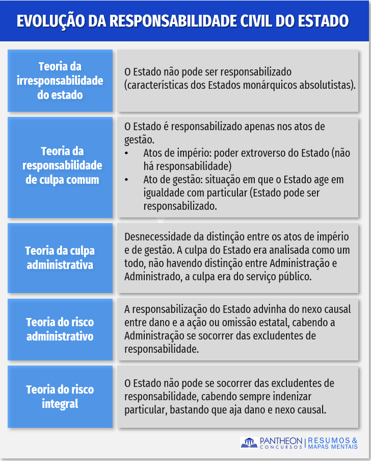 A responsabilidade civil pode ser entendida como a obrigação de se reparar os danos causados mediante indenização. Ao longo do tempo foram diversas as teorias relativas à responsabilidade civil do Estado abaixo vamos esquematizar as teorias que serão analisadas a seguir: Teoria da irresponsabilidade do estado; Teoria da responsabilidade de culpa comum; Teoria da culpa administrativa; Teoria do risco administrativo; e Teoria do risco integral.