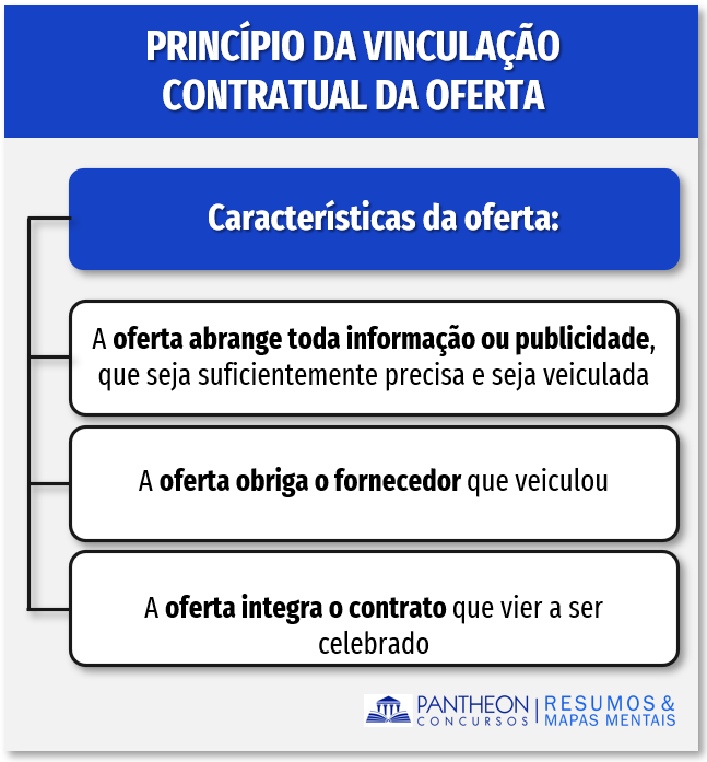 Dessa forma, basta a veiculação de uma informação, que seja suficientemente precisa, sobre o produto ou serviço, para que haja a obrigação do fornecedor em relação aquele produto ou serviço. Portanto, o princípio da vinculação contratual da oferta, de forma resumida, estabelece a obrigatoriedade de o fornecedor cumprir aquilo que foi ofertado, pois ao ofertar esta passa a ser parte integrante do contrato.