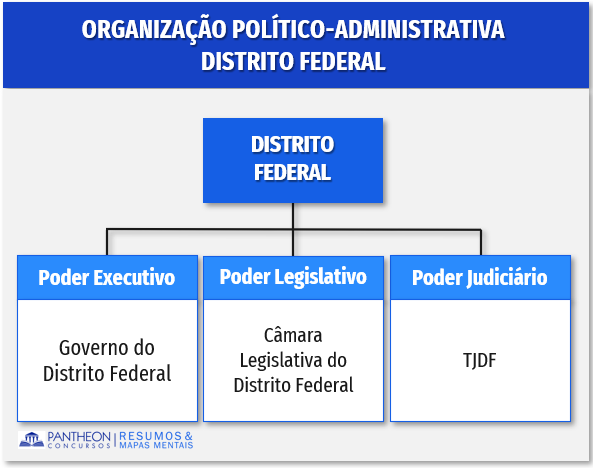O Poder Legislativo do Distrito Federal é unicameral, formado pelas Câmaras Distritais, que têm como integrantes os Deputados Distritais. Possui como chefe do Poder Executivo o Governador do Distrito Federal. O Distrito Federal não pode ser dividido em Municípios, além de não haver previsão de criação de regiões metropolitanas, aglomerações urbanas e microrregiões.