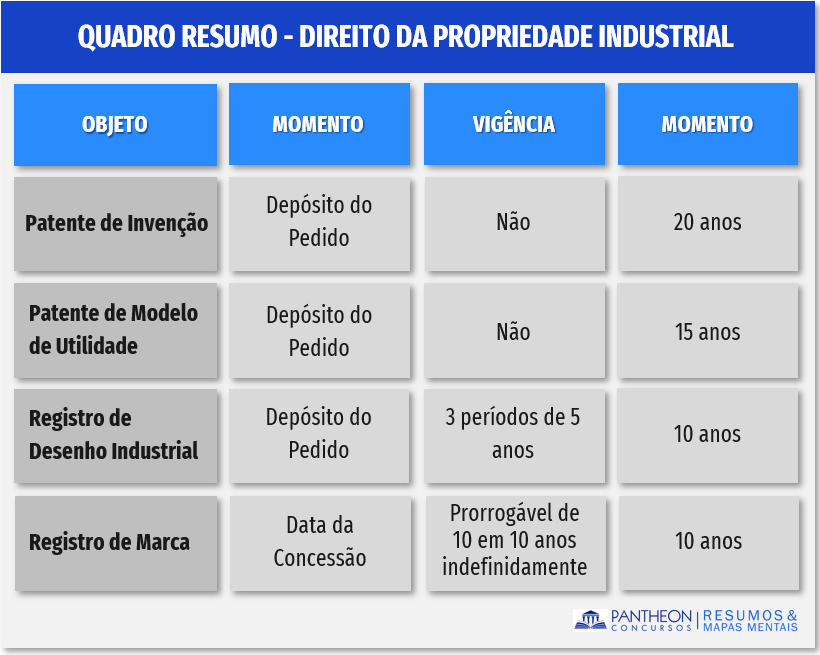 Por fim, trago uma tabela trazendo todos os prazos relativos à invenção, ao modelo de utilidade, ao desenho industrial e à marca: