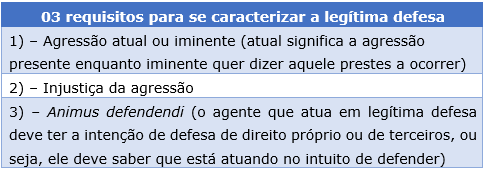 Segundo o artigo 25 do Código Penal, entende-se em legítima defesa quem, usando moderadamente dos meios necessários, repele injusta agressão, atual ou iminente, a direito seu ou de outrem. Isto é, temos 03 requisitos para se caracterizar a legítima defesa: