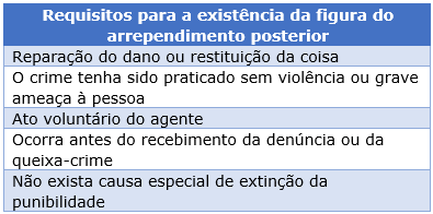 Vejam então que temos os seguintes requisitos para a existência da figura do arrependimento posterior: