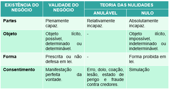 Abaixo montamos um quadro que sintetiza a existência, a validade e as hipóteses de nulidade dos negócios jurídicos.