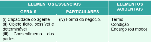 Quadro: Elementos essenciais e acidentais do negócio jurídico