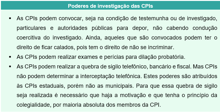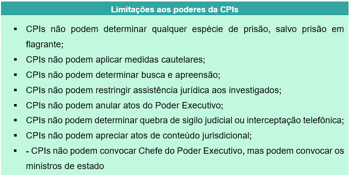 O Poder Legislativo tem as funções típicas de legislar e fiscalizar, as comissões parlamentares de inquérito (CPIs) desempenham, justamente, a função fiscalizatória. As CPIs, como comissões temporárias, têm prazo certo de duração e objetivo específico, que é apurar fato determinado.