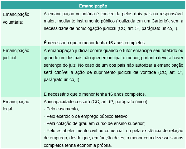 A emancipação pode ser: voluntária, judicial e legal.