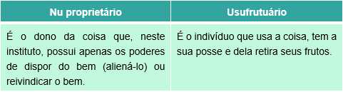 O instituto do usufruto é aquele que permite ao terceiro maior amplitude do gozo da coisa alheia. No usufruto o proprietário transmite a terceiro (usufrutuário) os direitos de usar (uso) e retirar os frutos advindos desta coisa (fruto). O proprietário (nu proprietário), no usufruto, terá o direito de reaver e dispor.