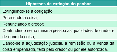 Por fim cabe destacar as hipóteses de extinção do penhor, estabelecidas na forma do artigo 1.436 do Código Civil: